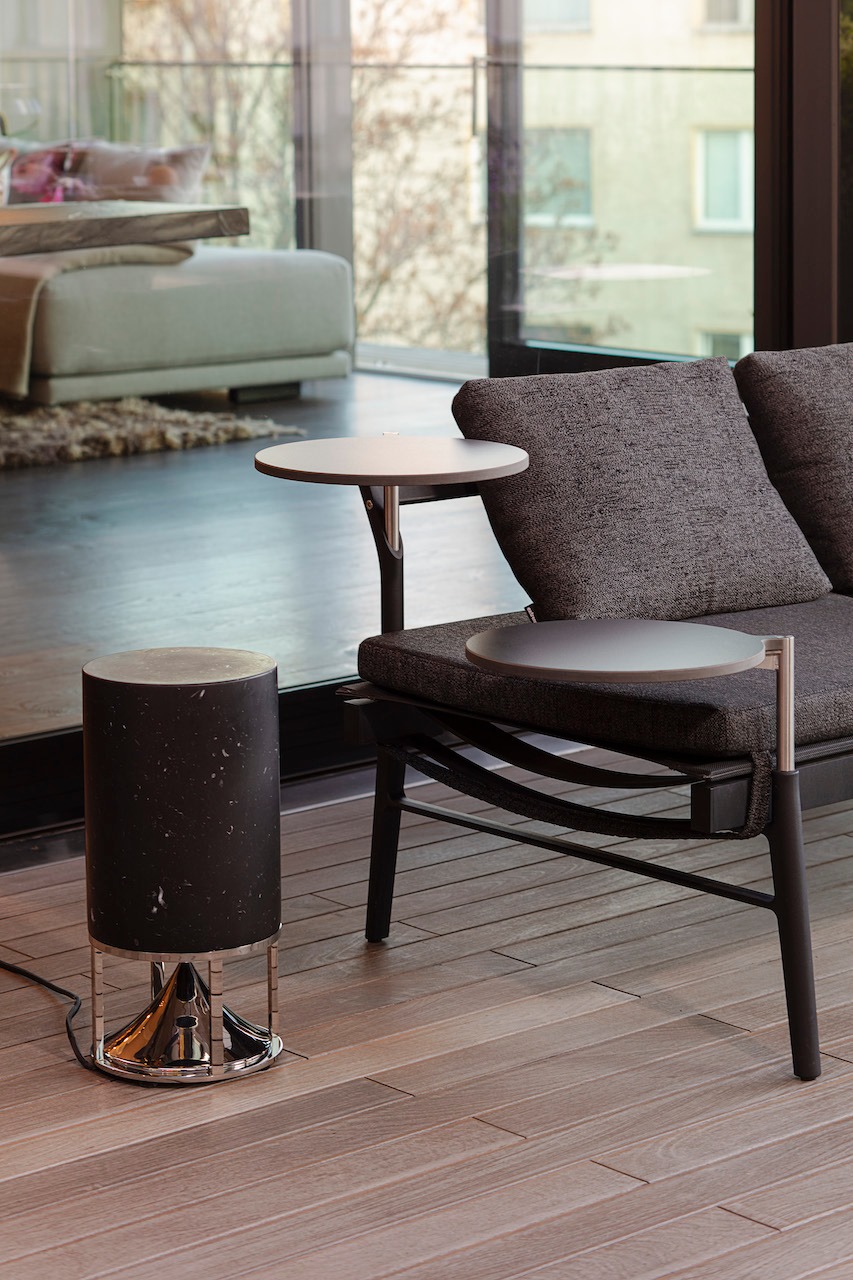 Hochwertiger wetterfester Säulenlautsprecher aus schwarzem Mamor und Edelstahl-Sockel sorgt für ein perfektes Klangerlebnis. © Fotografie Gabriel Büchelmeier