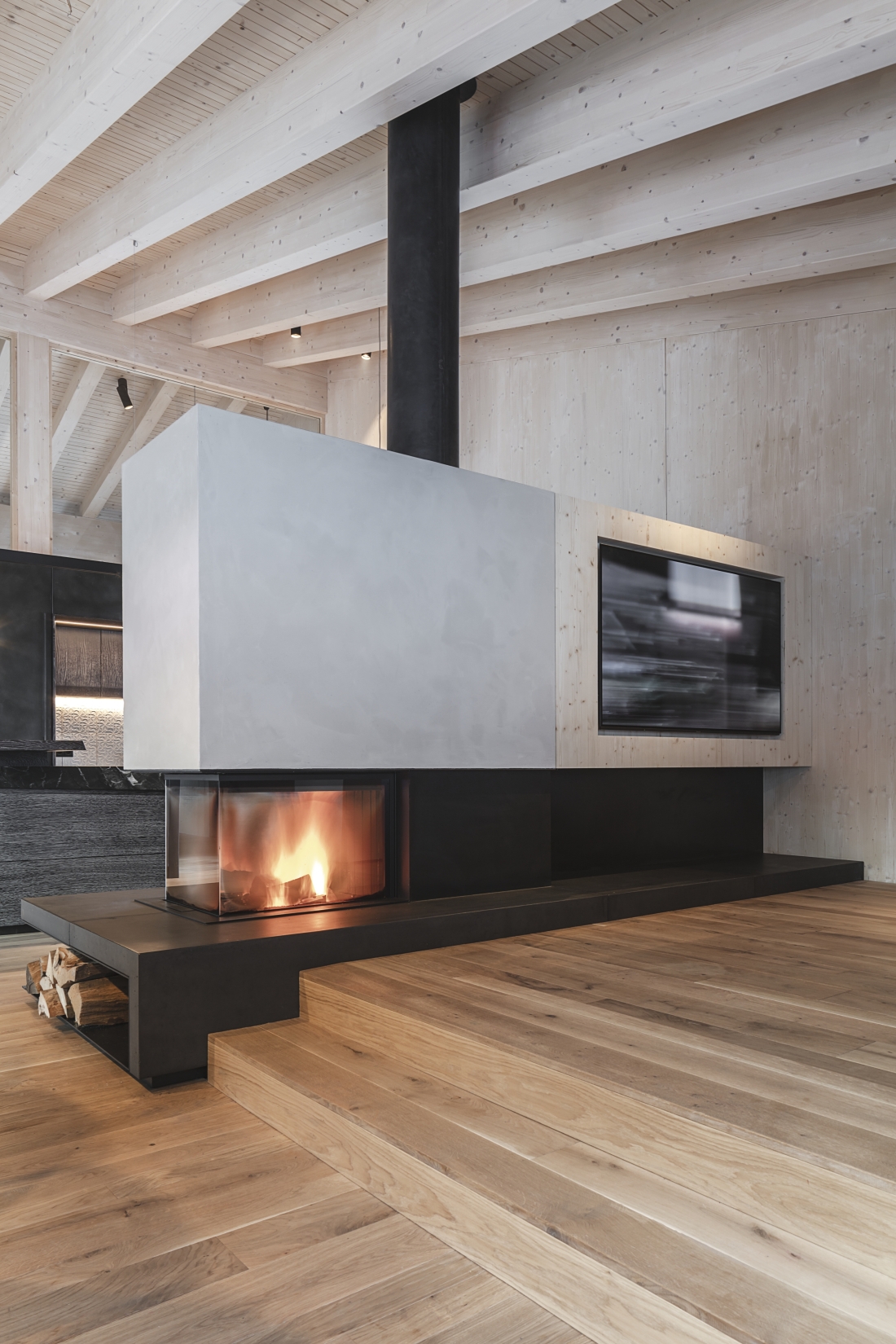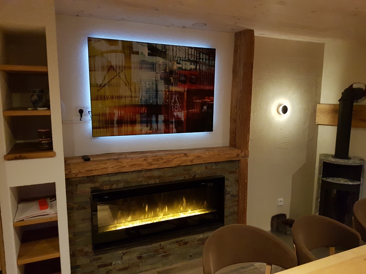unsichtbares 5.1 Heimkino integriert in den Wohnraum. Völlig unsichtbar verschwinden die Lautsprecher in der Holzdecke und Trockenbauwand.