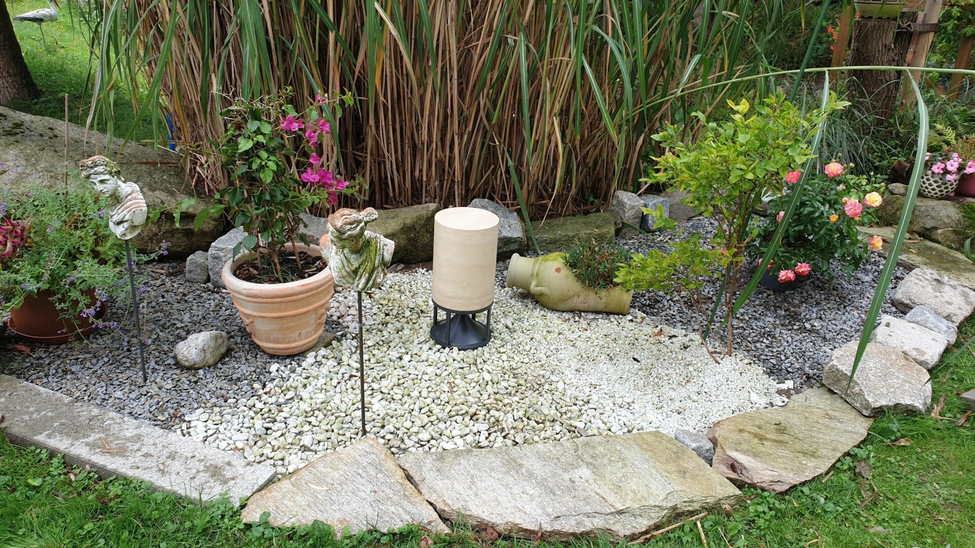 Zylinder Travertin, grauer Sockel